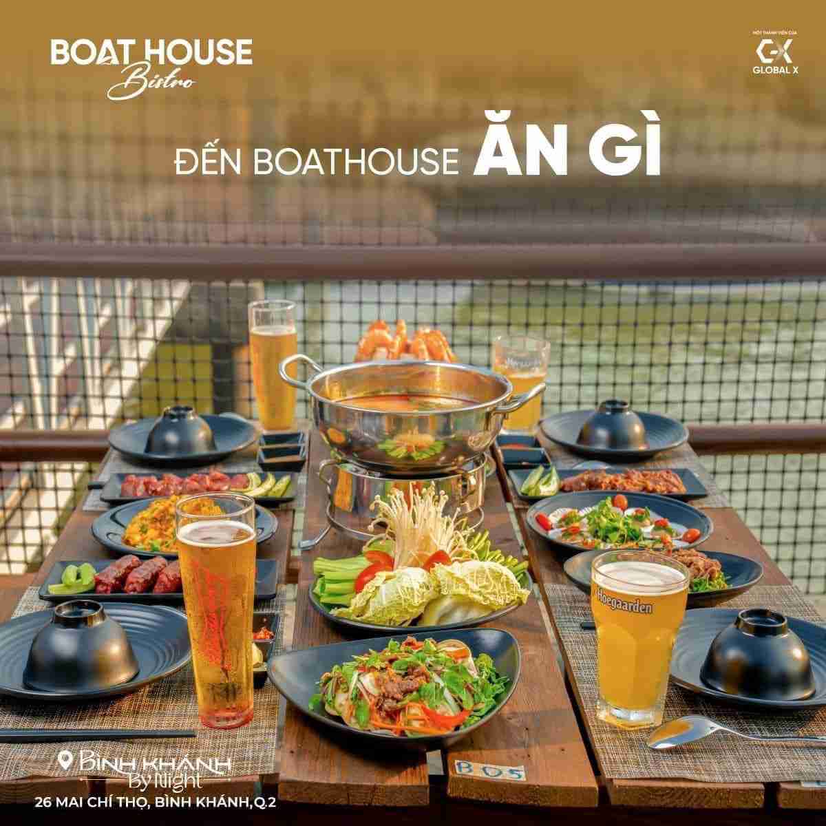 Boat House Bistro nằm tại tổ hợp Bình Khánh By Night: 26 Mai Chí Thọ, Phường Bình Khánh, TP Thủ Đức, TP. HCM. Đây là 1 ví trí giáp sông đem đến những bữa tiệc cực kỳ ấn tượng dành cho thực khách. Ẩm thực, nhạc, khung cảnh lãng mạn nên thơ.